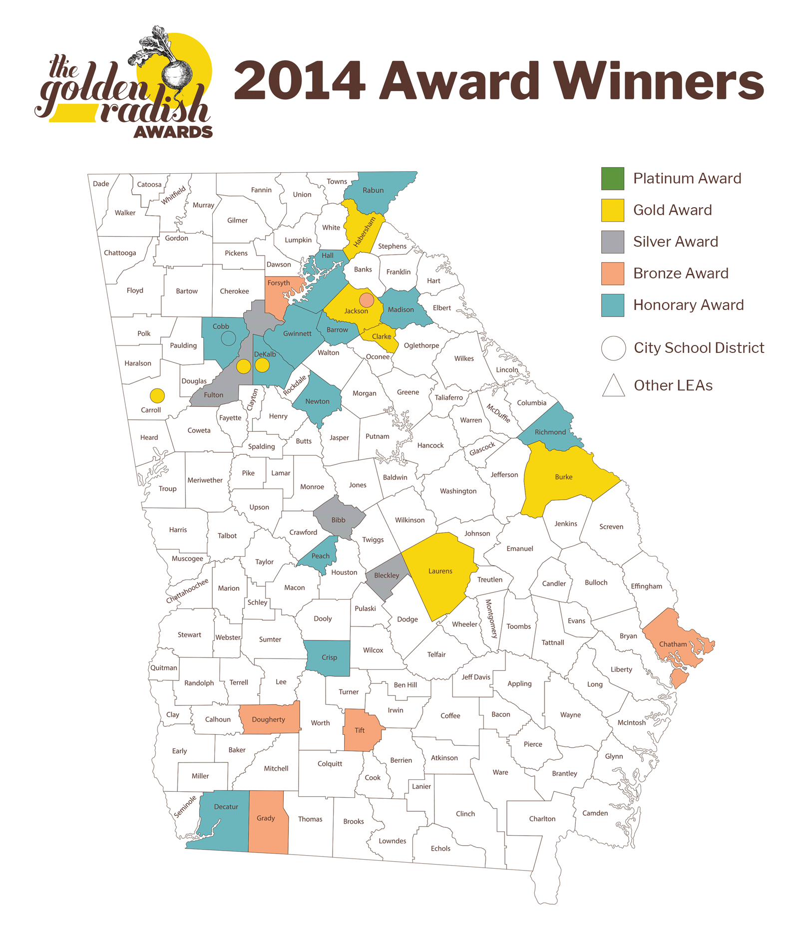 From 2014 through 2019, Georgia Organics, with the Georgia Departments of Agriculture, Early Care and Learning, Education, and Public Health, and UGA Extension, celebrated Georgia Farm to School best practices with the Golden Radish Award.